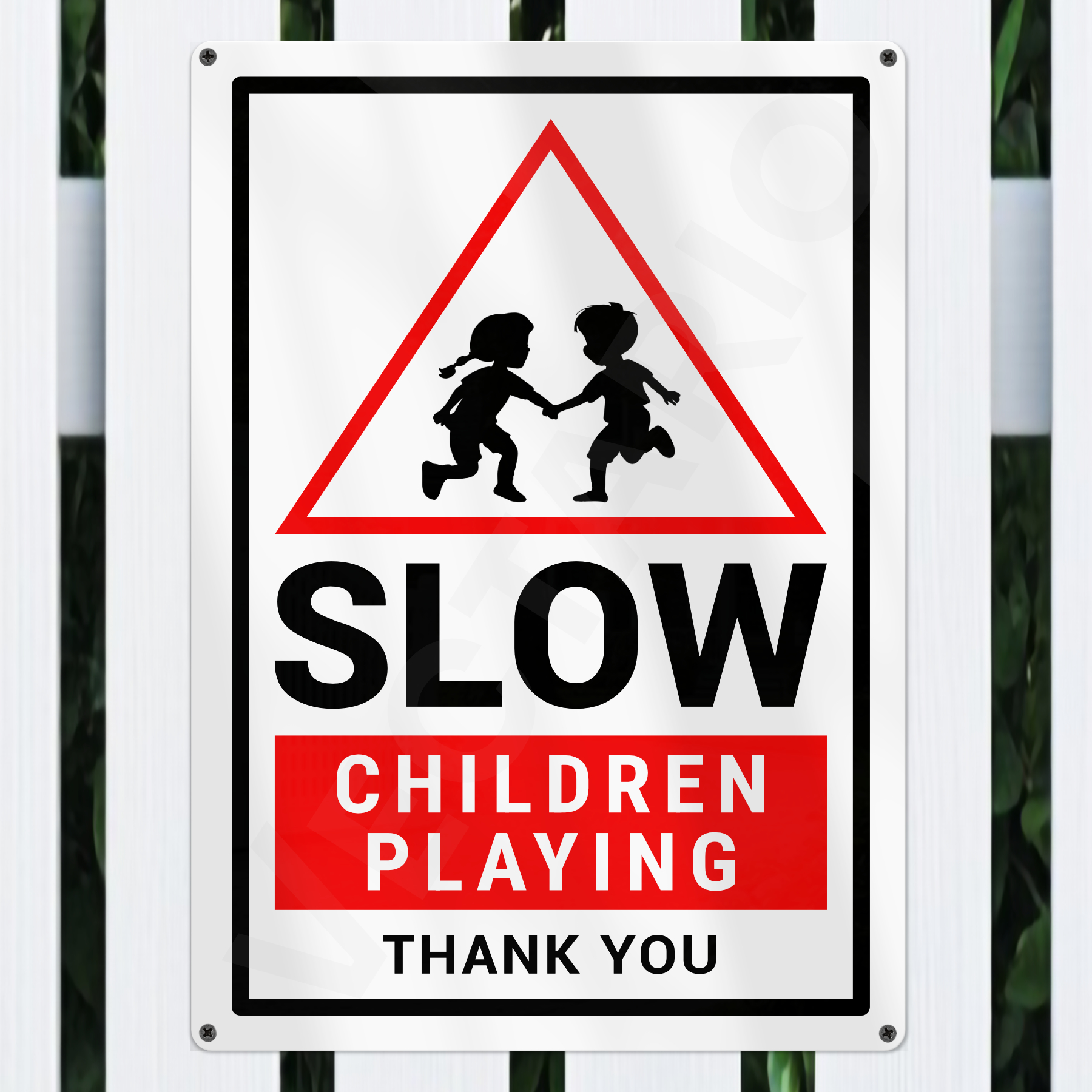 This aluminium sign measures 200mm x 300mm, features rounded corners, and is ideal for mounting on gates, fences, sheds, or walls.